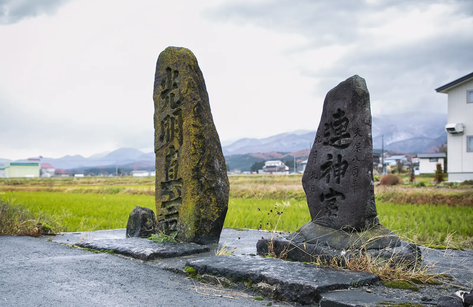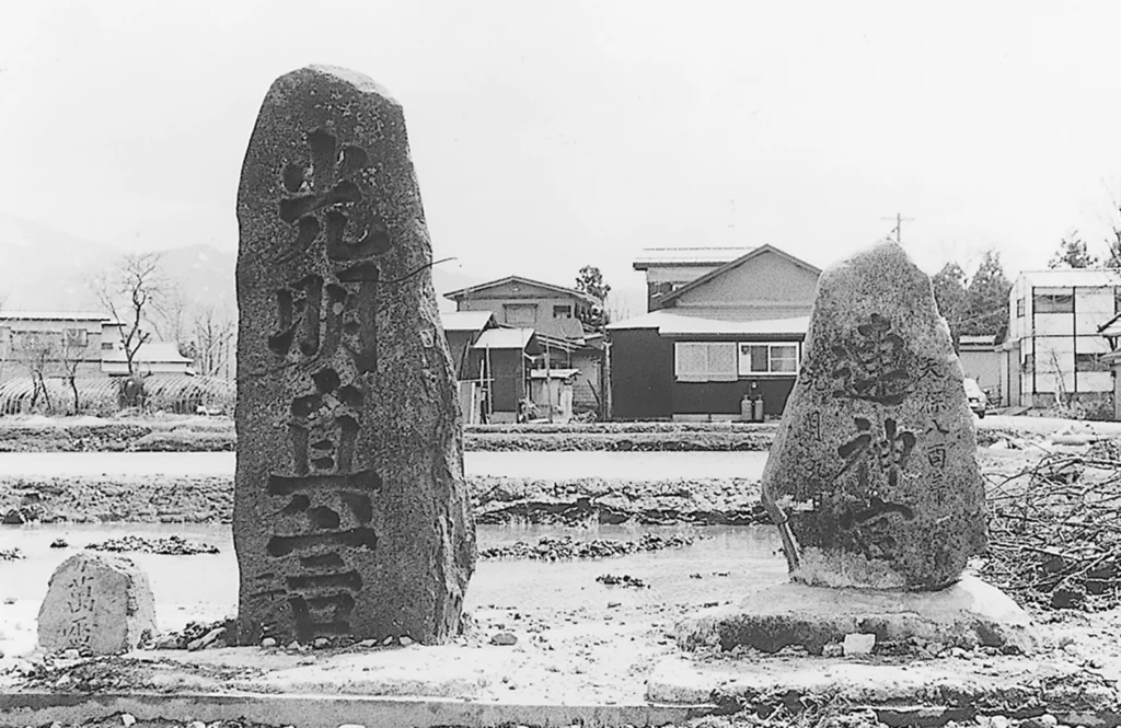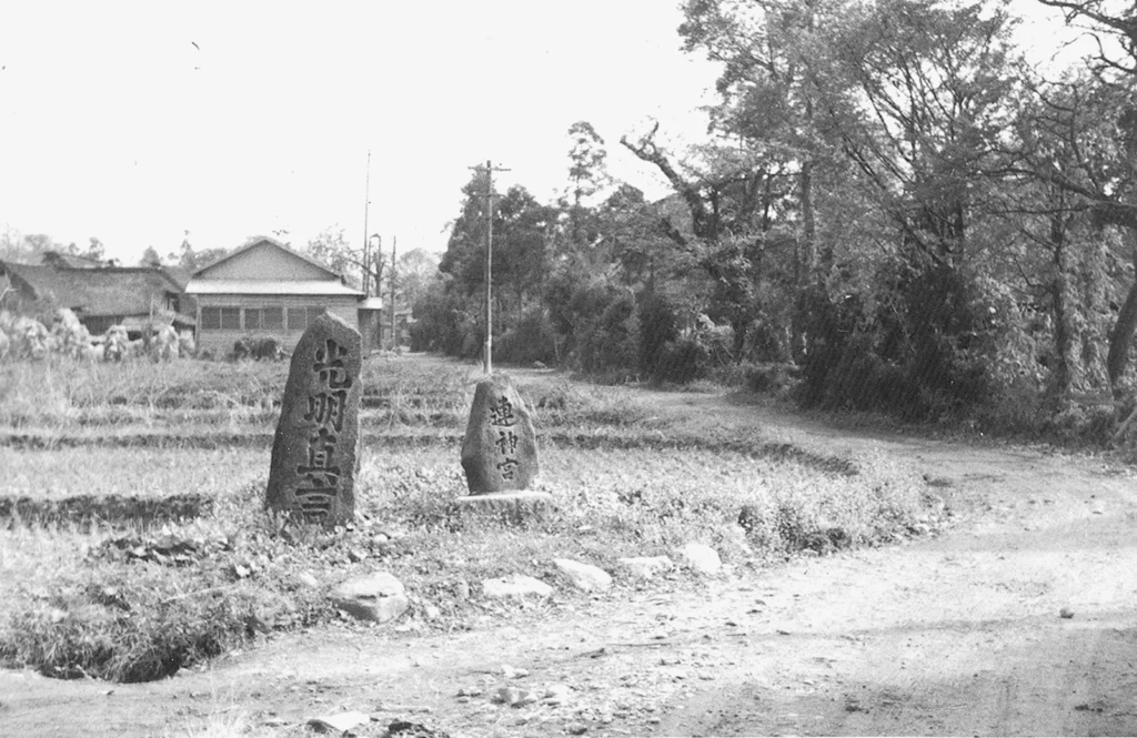 昭和時代の頃と推定される連神宮碑と光明真言碑。当地はいまも周辺の三角山や亀割山が見える長閑な風景が広がっている。画像協力:新庄市、新庄デジタルアーカイブ(撮影者不明)