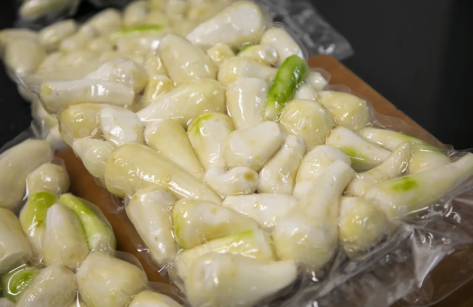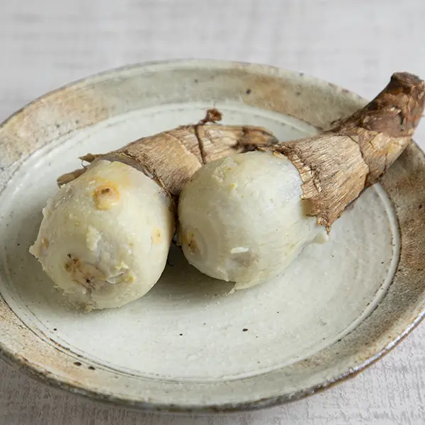 一般的な里芋の特徴でもある皮と中身の間にあるヌメリが少なく、中身は柔らかいのに、濃密であることから煮崩れしにくい甚五右ヱ門芋。芋煮、唐揚げ、コロッケ、サラダ、グラタンなど、一般的な芋レシピで調理してももちろん美味しいが、最もおいしい食べ方と春樹さんがおすすめするのは「衣被(きぬかつぎ)」。皮に切込を入れて蒸して皮ごと蒸し、手でつるりと皮をむいてそのまま食べると本来の甘みと食感を最大限に感じることが出来るという。