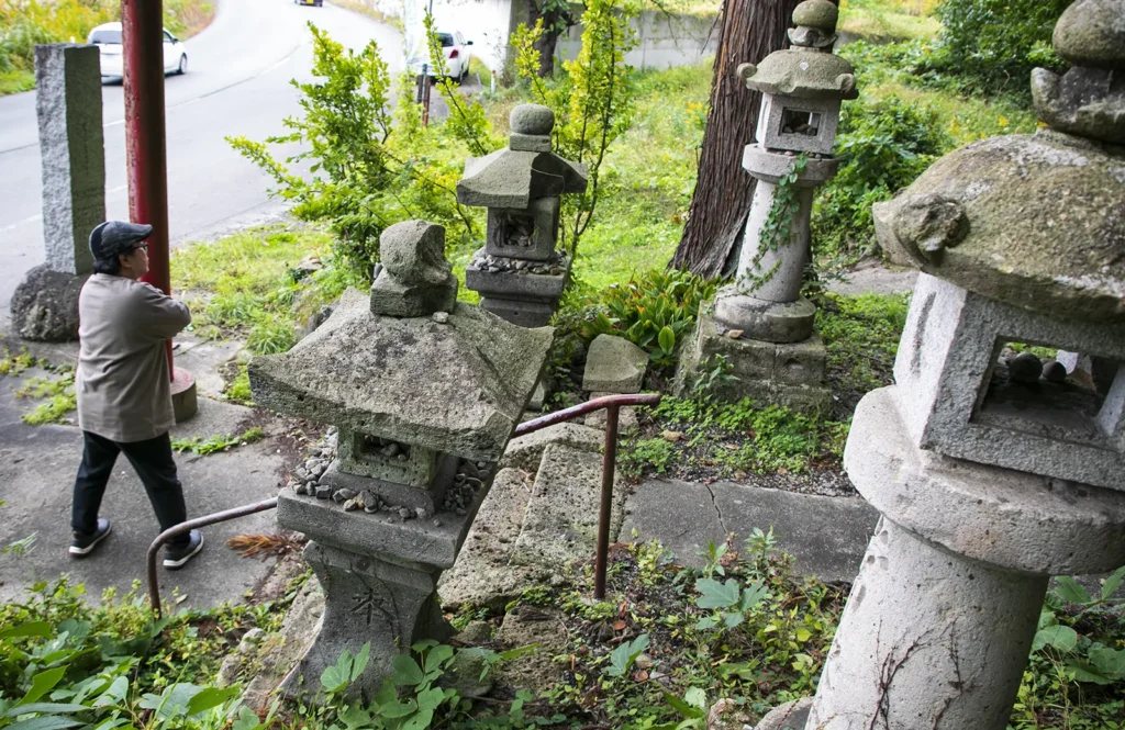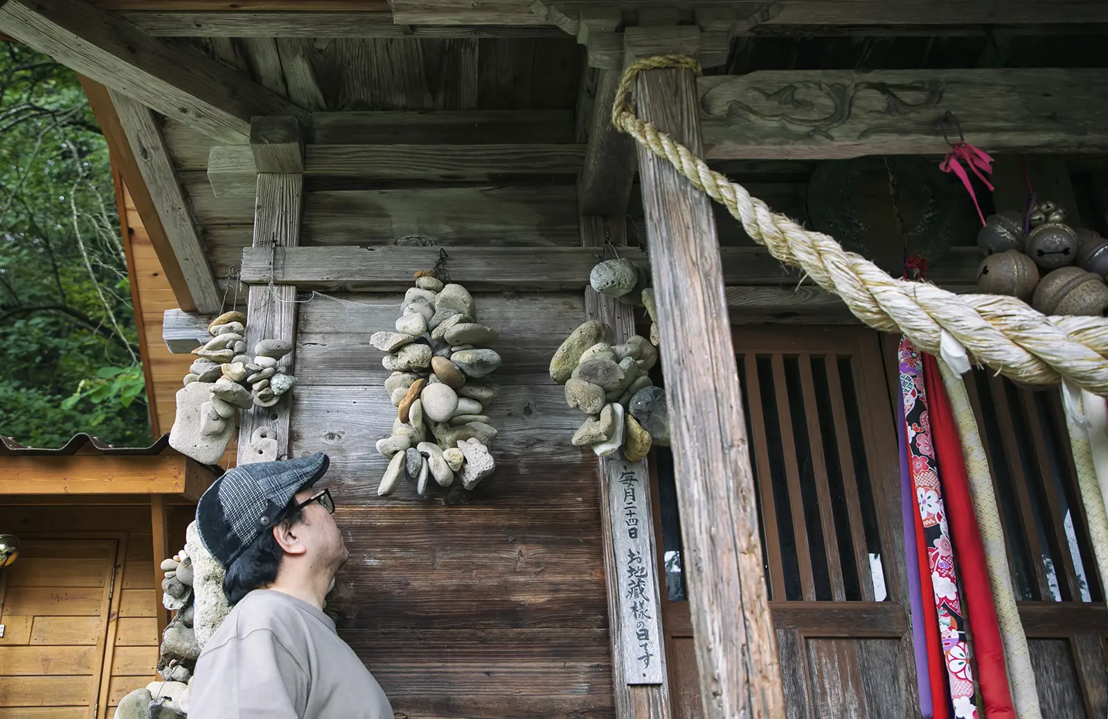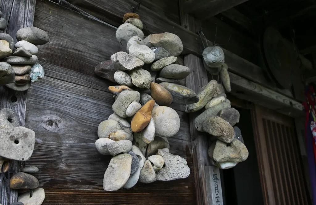 ご利益を求めて遠方からの参拝者もいるという。お堂周辺には休憩できる詰所や山神と猿田彦が祀られている。外壁には奉塞物の無数の穴開き石が吊り下げられ、下にもいくつか石が落ちている。