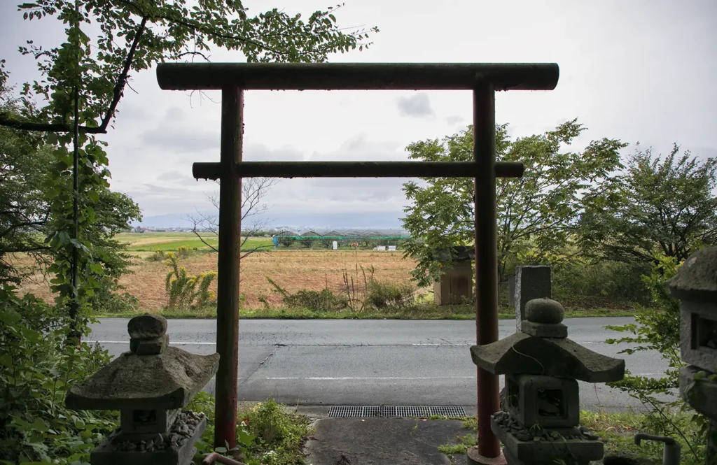鳥居から平野を見渡す。そこは、かつて存在した、最上川の「藻が湖」と呼ばれた大きな沼地に沿った山際の、集落同士の中間地点であり境であったところ。鳥居の後ろは山、道路を隔てた平野には昔「藻が湖」があった。いまは米や果樹などの圃場が広がる