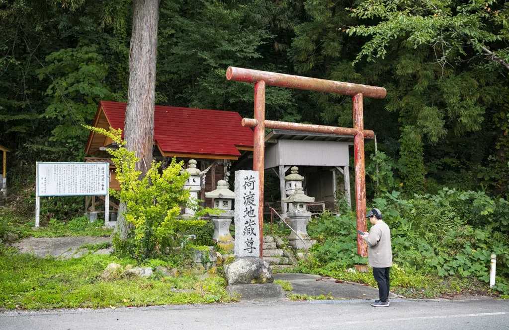 周辺には山神の石碑と猿田彦を祀る「幸神社」の札が添えられた小祠があり、正面には荷渡地蔵尊が祀られている。つまりここには猿田彦と地蔵菩薩の、本来異なる系統の神仏が併存しているのだ。