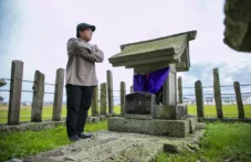 そんな激動の変遷をうかがいながら車で移動していると、ほどなく旧境内地に到着。12代景行天皇の皇子である御諸別皇子(みもろわけのおうじ)が当地で亡くなった際に陵所(墓所)に植えた「皇壇の杉」が樹齢1800年の老杉となったいまも大切に保存されていた。その周辺には、大日坊歴代貫主の墓碑をはじめ、萬霊を慰める供養塔、即身仏 真如海上人の記念碑、日本一大きい庚申塔、弘法大師が湯殿山に入る前に雪解けを待って護摩を焚いた護摩壇跡、山内寺院住職らの墓碑など、苔むしてはいるが幾多の由緒ある遺構が目にとまる。