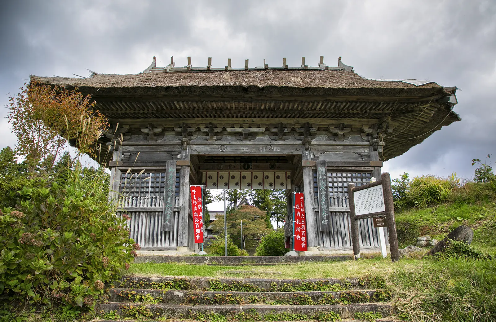 鎌倉時代に創建された大日坊の「仁王門」は、正面左右に異様な風格をそなえた風神雷神像が安置され、その奥には鎌倉時代運慶作と伝わる仁王像が鎮座している。4本の門柱の前後に控柱(ひかえばしら)が計8本ある三間一戸の「八脚門(はっきゃくもん、やつあしもん)」としては日本最古であり、国宝級といっても過言ではない建築だ。