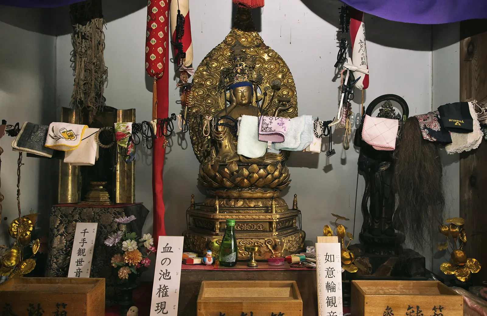 中央に鎮座するのが「血の池権現」。また、子授けや安産のご利益があるとされる「如意輪観音」も傍にあり、比較的女性の参拝者が多いという。壇の傍には女性の長い毛髪・ハンカチ・ストッキングなどが奉納されていた。