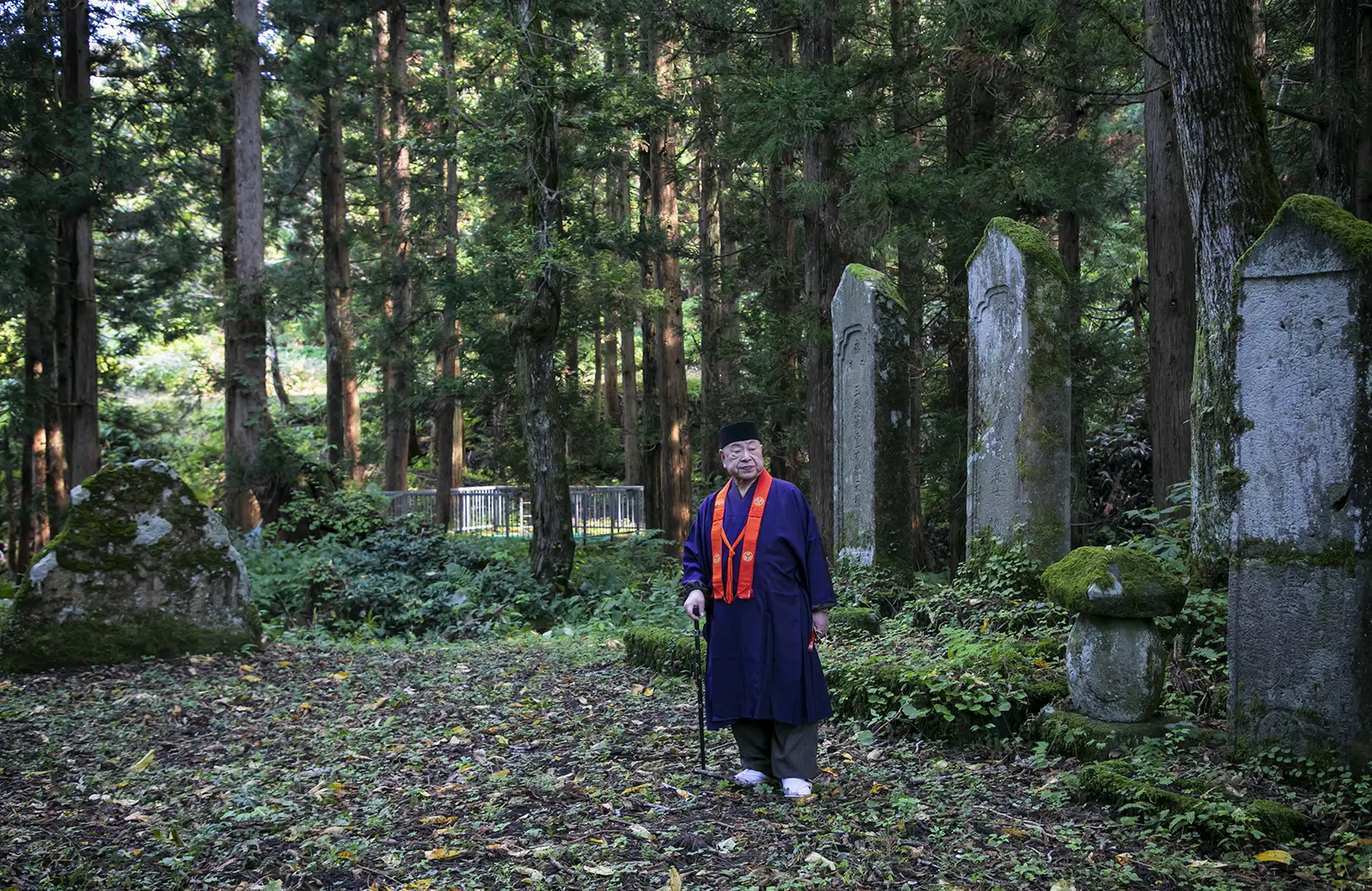 旧境内の急斜面を降りて『血の池』跡地へ案内してくださる遠藤貫主。旧境内へ参るときはいかなる場合でも正装だ