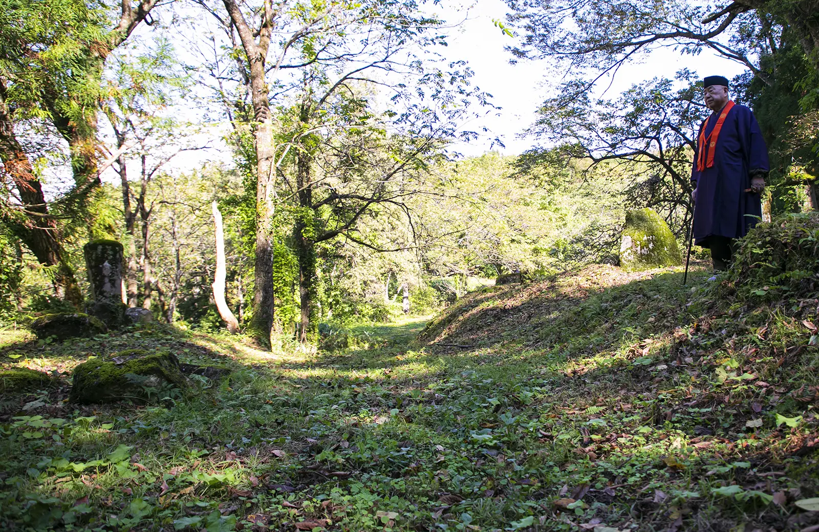 窪地になっている一帯が『血の池』跡地だったという。当時の池の様子や御堂があった場所など、貫主の鮮明な記憶と解説を頼りに辺りを歩いた