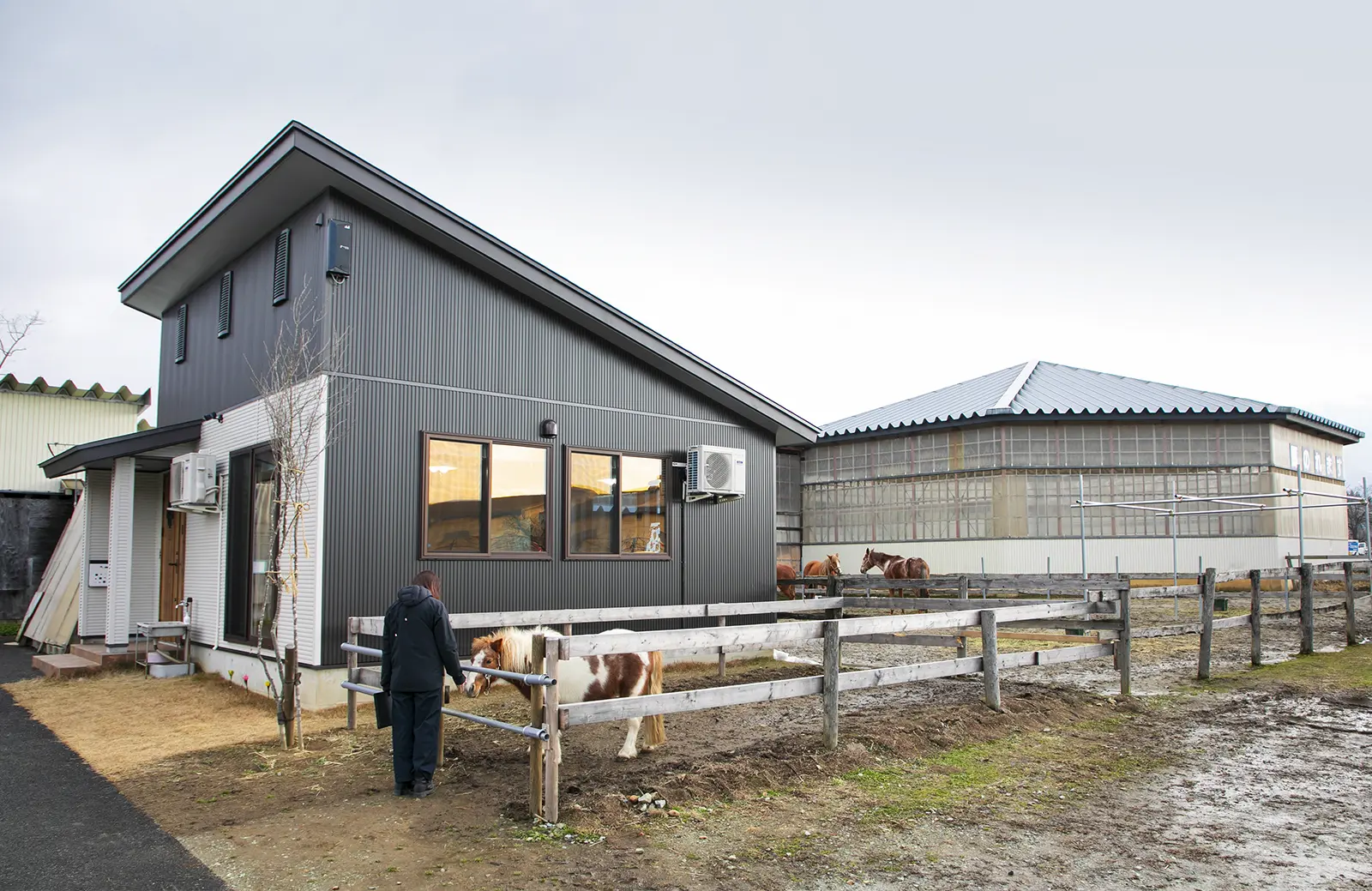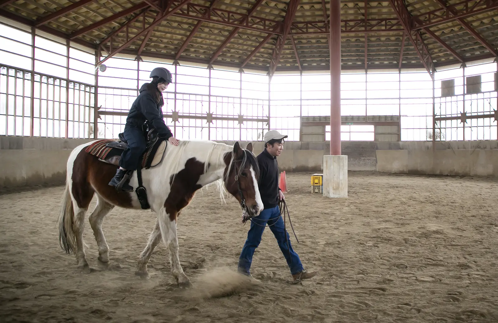 村山市ののどかな田園地帯に位置する「ホースガーデンむらやま」は、まず目を引くのが八角形の巨大な屋根を持つ全天候型屋内馬場。東北特有の冷たい雨や雪といった天候の変化に左右されることなく、一年中いつでも快適に乗馬を楽しめる環境が整えられている。