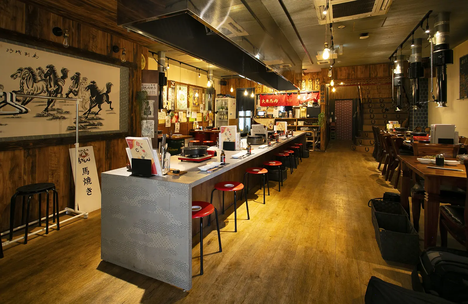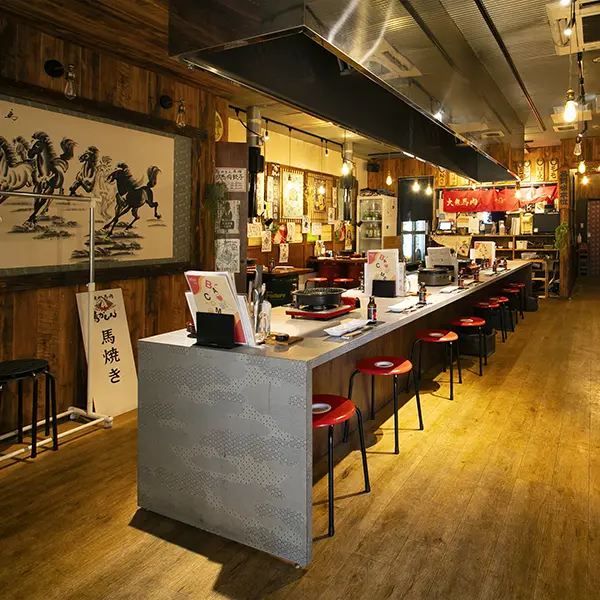 昭和のノスタルジーを感じさせる気取らない佇まいの大衆馬肉酒場。明朗な若い店員たちが店内の活気を引き立てていた