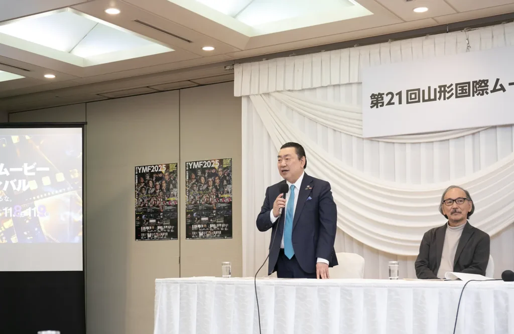さる2025年10月21日、第21回山形国際ムービーフェスティバル(YMF2025)開催概要の発表の記者会見が、山形グランドホテルにて行われた。主催する『東北ケーブルテレビネットワーク』代表取締役社長の吉村和文さん(ダイバーシティメディア代表取締役社長)は、「ここまで続けられ、21回目を迎えるにあたり、支えていただいた関係者の皆さんに感謝と御礼を申し上げたい。YMFは映画文化を発信し続ける映画祭であるとともに、映画に関わるすべての人に尊敬の意を表し、映画愛に包まれたあたたかい映画祭を目指してまいります」と語る。